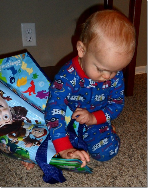 Cale is one smart cookie. He’s already figured out that there are toys in this bag just for him. This morning, he couldn’t get down out of my arms fast enough. He grabbed the bag off of the table and tackled it.